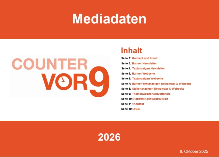 Ja, ich möchte den Newsletter Counter vor9 täglich lesen. Ich erhalte Counter vor9 kostenlos und kann der Bestellung des