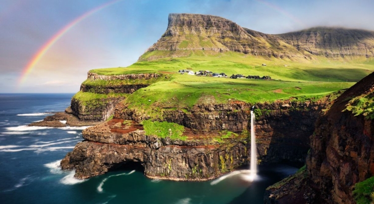 Der Múlafassor Wasserfall stürzt auf der Insel Vágar 100 Meter in die Tiefe